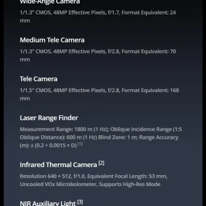 - Camera Tele: Cảm biến CMOS 48MP hỗ trợ Hybrid Zoom siêu xa. Giúp cảnh sát hoặc kỹ sư phóng to đọc rõ biển số xe hoặc mã vạch thiết bị mà không cần bay sát lại gần gây chú ý.
